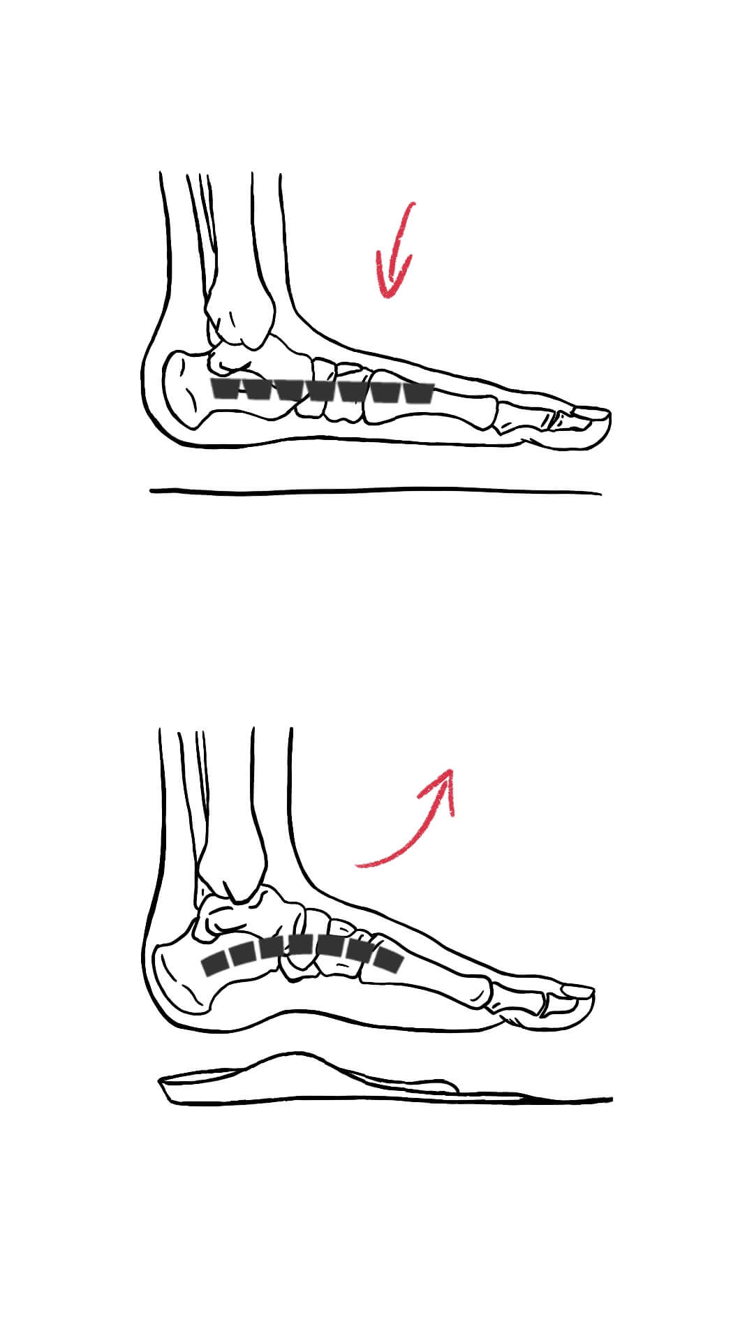 - Fußfehlstellungen: Bestimmte Fehlstellungen an den Füßen wie Plattfüße, Senkfüße und ein erhöhtes Fußgewölbe können die Art und Weise verändern, wie das Gewicht auf den Füßen verteilt wird, was wiederum die Plantarfaszie zusätzlich belasten kann. Auch können Fehlstellungen die Belastung der Sehnen und Bänder erhöhen. Beim Senk- und Plattfuß zum Beispiel, erhöht sich der Zug auf die Plantarsehnen und damit auch auf die Anteile, die an der Ferse ihren Ursprung haben. Genau da, wo der Fersensporn dann entsteht.