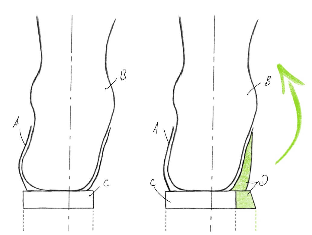 Gerade bei Fehlstellungen mit Achsabweichungen im Lotaufbau nach innen oder außen und Instabilitäten können mit einer Absatzverbreiterung gut versorgt werden. Zusätzlich kann eine Einlagenversorgung Sinn machen um eine Korrektur herbeizuführen. Die Absatzverbreiterung sichert die Statik und ein "Wegtreten" bzw. Abweichen nach innen oder außen kann verhindert werden.