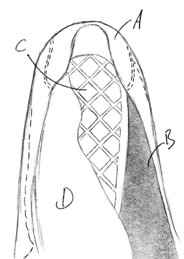 Abb. 1: A: Schuhhinterkappe, B: Schuhinnenraum, C: Wabenmuster, D: Brandsohle/Decksohle