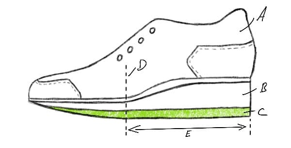 Abb. 6: A: Konfektionsschuh, B: Laufsohle, C: Zurichtungsmaterial, D: Scheitellinie (rückverlagerte Ballenrolle), E: Standfläche
