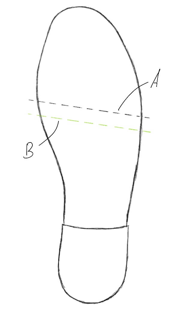 Die zweite Zurichtung die ich vorstellen möchte, kommt aus dem Bereich der Veränderungen an der Laufsohle. Es werden also keine richtigen Rollen unter den Schuh gebaut, sondern zusätzliches Material. Die verschiedenen Sohlenrollen können in Zehenrollen, Ballenrollen, rückverlagerte Ballenrollen, Mittelfußrollen und Tintenlöscherrolle eingeteilt werden. Sie unterscheiden sich durch die Position der Scheitellienie und somit auch in ihrer Funktion und Wirkung.
