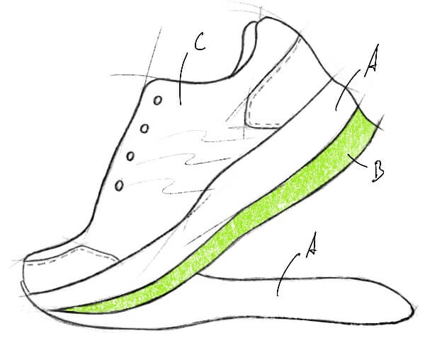 Abb. 4: Zurichtung, A: Laufsohle, B: Zurichtungsmaterial, C: Konfektionsschuh